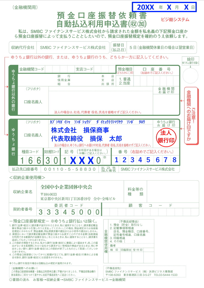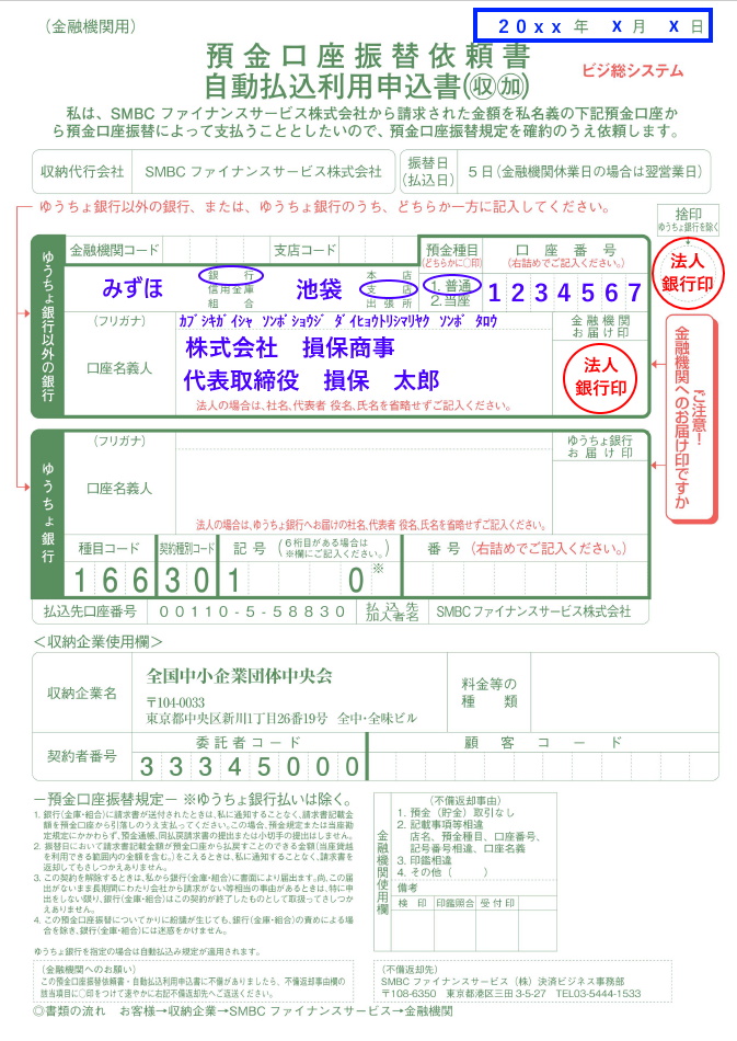 青字の個所を記入し、法人銀行印を押印してください。